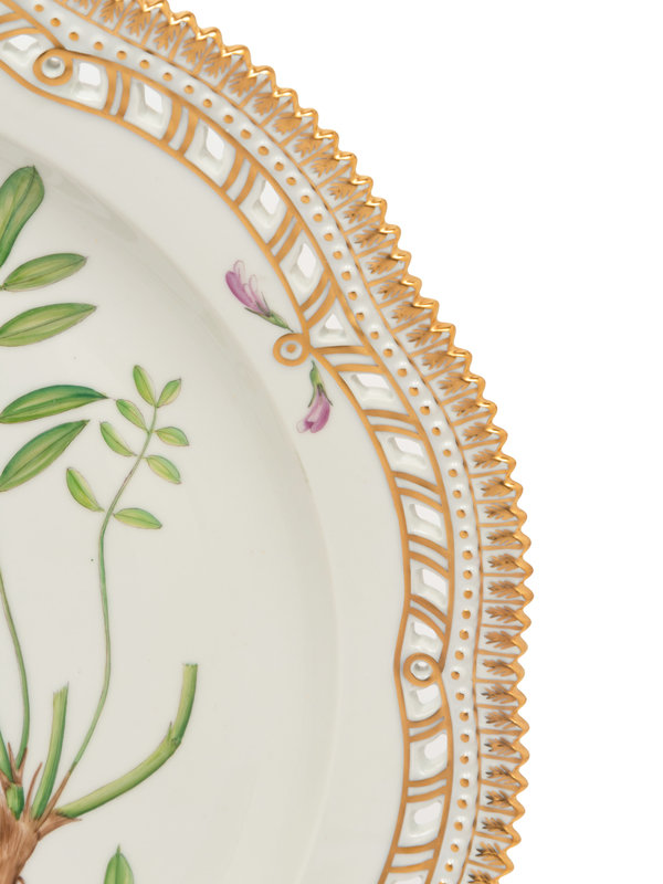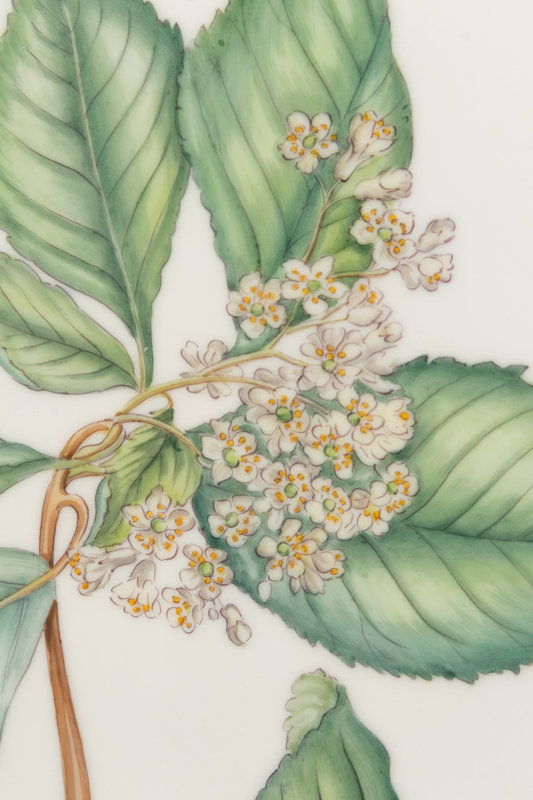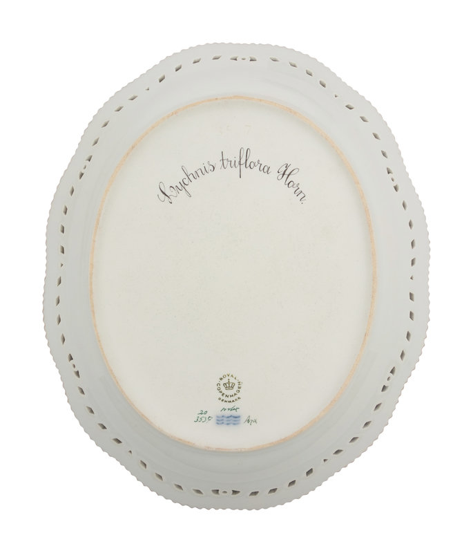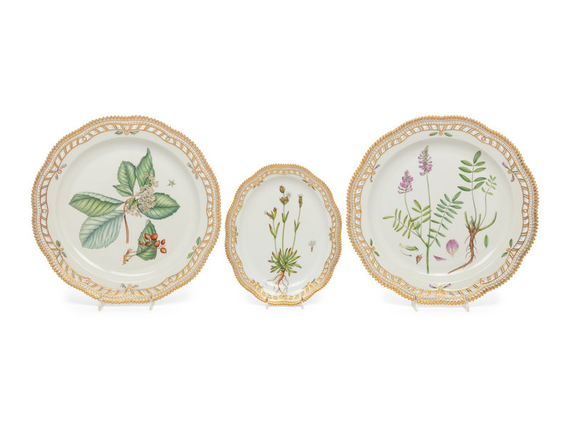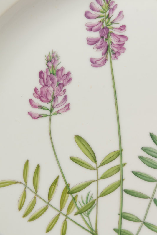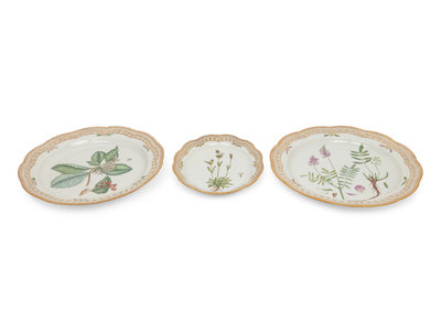 comprising two round examples and a smaller oval example, respectively decorated with Onobrychis sativa Lam, Sorbus hybrida Oed., and Lychnis triflora Horn.