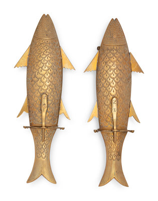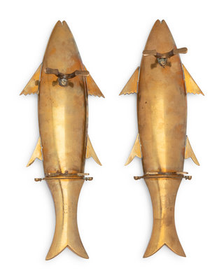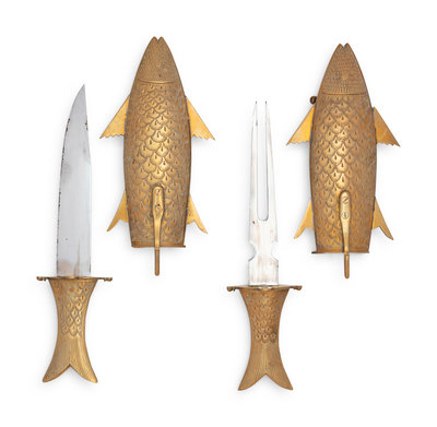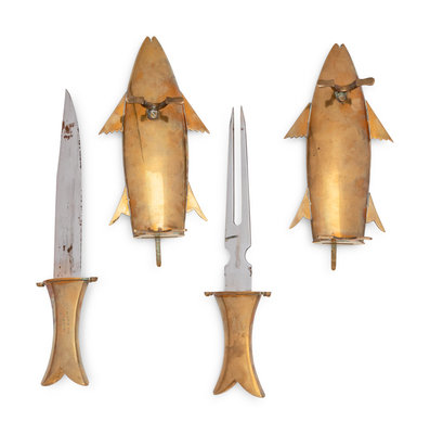 A Two-Piece Carving Set in Brass Fish-Form Sheaths
