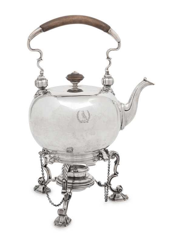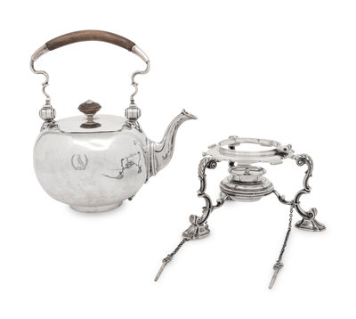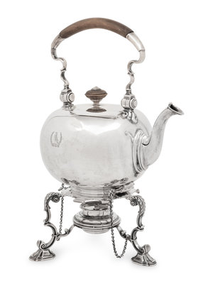 An English Silver Kettle on Lamp Stand