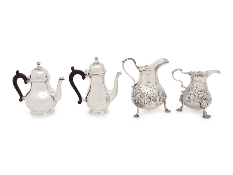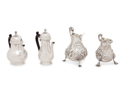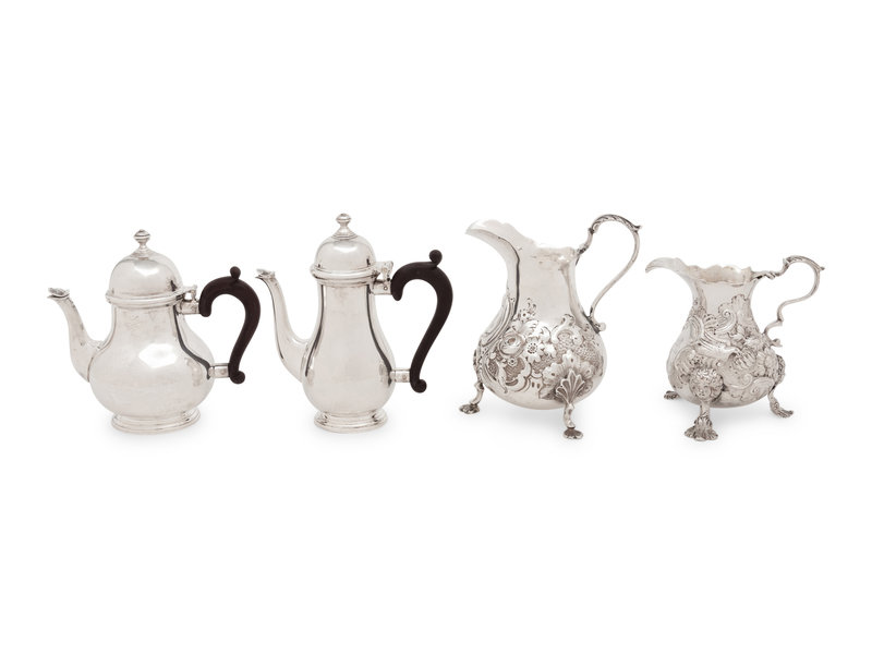 comprising two creamers and two bachelor coffee pots with wood handles.