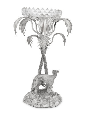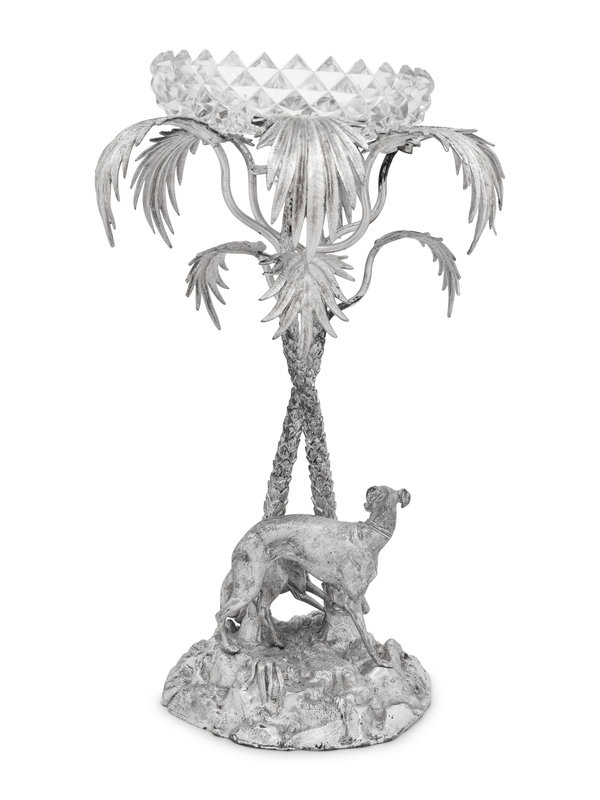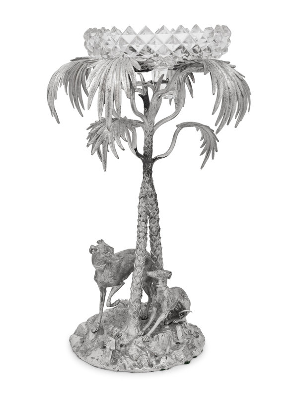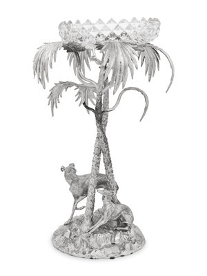 the bowl resting atop a palm tree flanked by two greyhounds at the base on a naturalistic ground; unmarked.