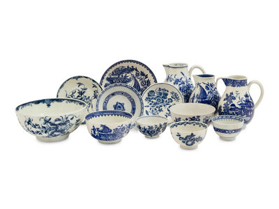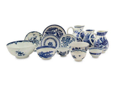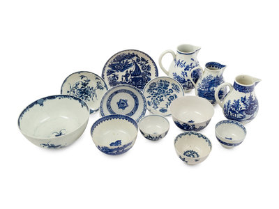 each having Worcester marks to the underside (three marks attributed), comprising seven plates, ten bowls and three creamer pitchers; 20 items total.
