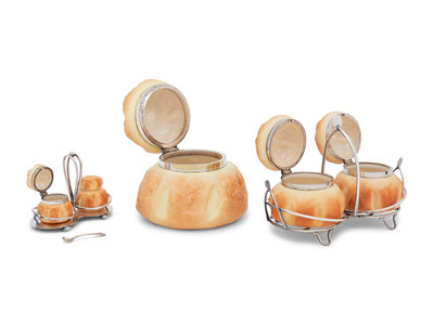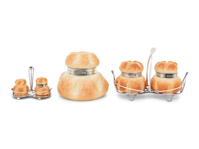 comprising a set of two jam jars in a silver-plate caddy, a pepper shaker and salt cellar with spoon in a silver-plate caddy and a hinged-lid jar; 5 items total.