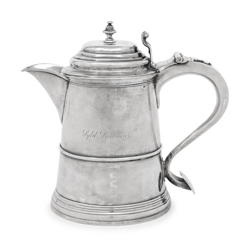 later adapted into a pitcher, the handle with bright-cut engraving SSA to SS and 1747, the body with later engraving Sybil Livermore.