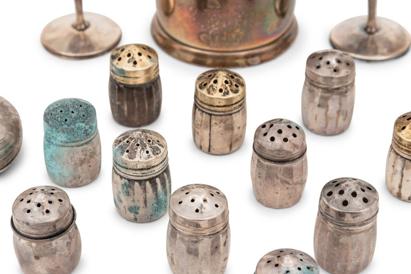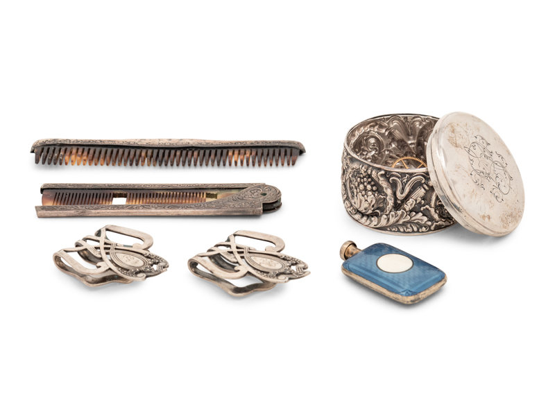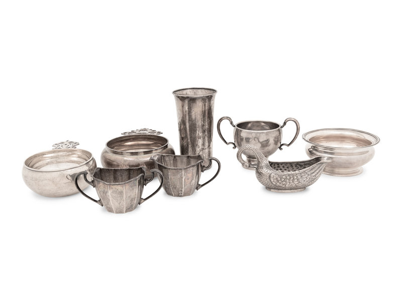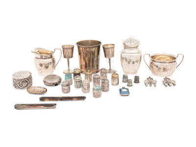 comprising a Fisher Silversmiths Inc. julep cup, a Tiffany & Co. patch box, a Lebkuecher & Co. presentation muffineer engraved 2nd Prize/ Automobile Flower Parade/ M.W.A./ June 23, 1905/ Mr. & Mrs. Oscar Greenwald/ Mrs. Louis Gimbel/ Lee Adam Gimbel/ Louis Gimbel Jr., a Wallace beaker engraved Bond Club of Chicago-1937, two creamer and sugar sets, an enameled scent flask, a Towle sugar bowl, two porringers, a swan-form master salt, a sugar bowl, a pocket watch case, a pair of cordials, three thimbles, two chatelaine clips, two comb holders, a bodkin and eleven salt casters; 36 items total.
