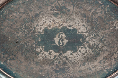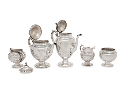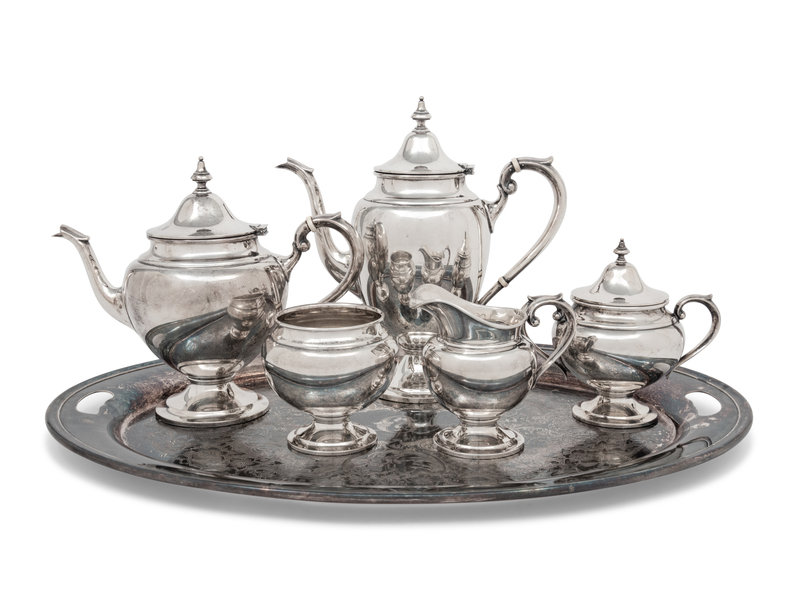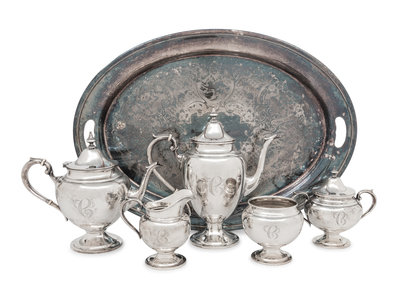 comprising a coffee pot, teapot, creamer, covered sugar and waste bowl, together with a silver-plate tray.
