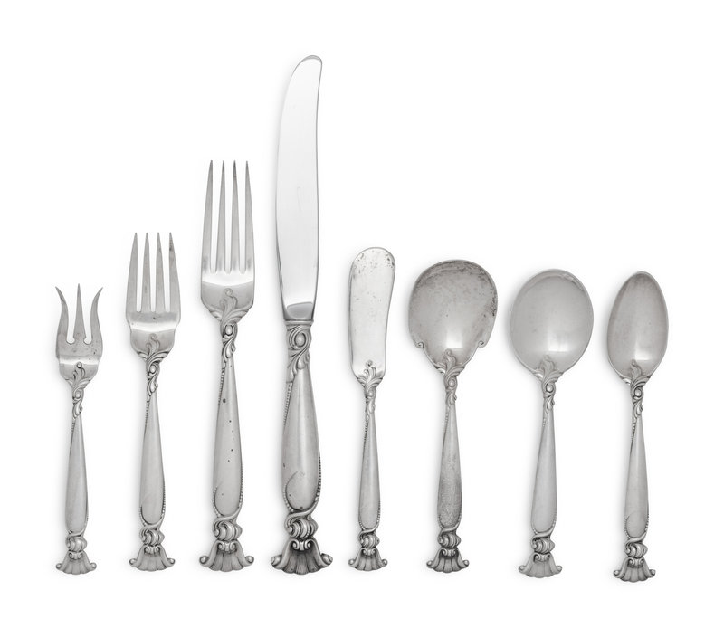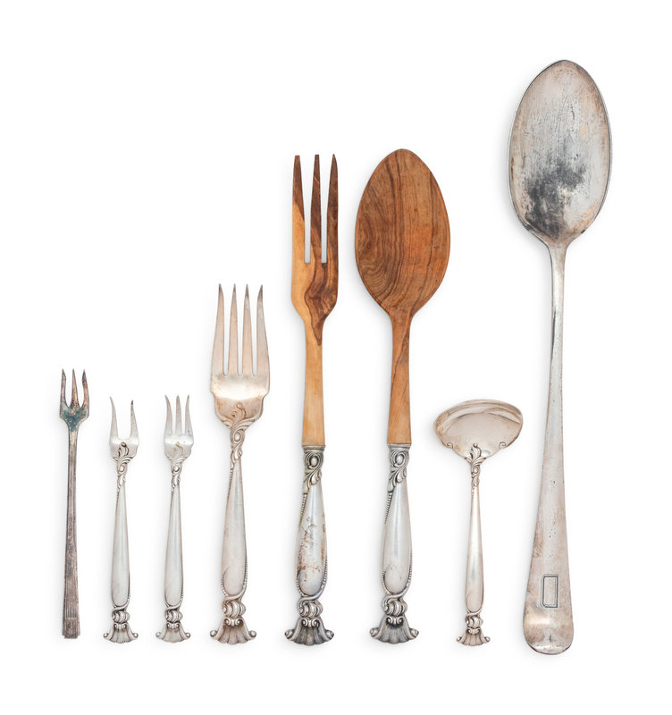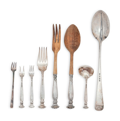 together with a silver-plate serving spoon and silver-plate oyster fork by other makers;