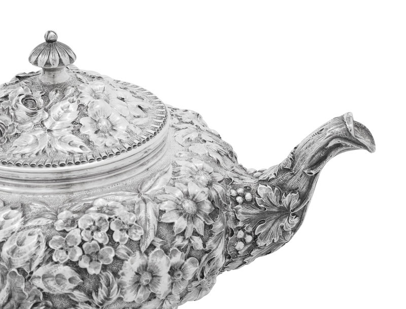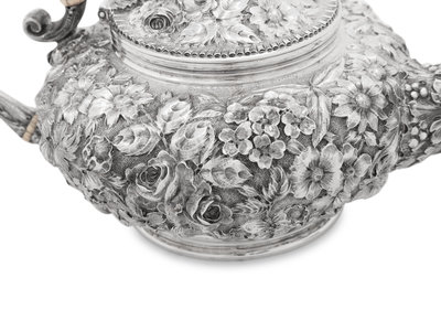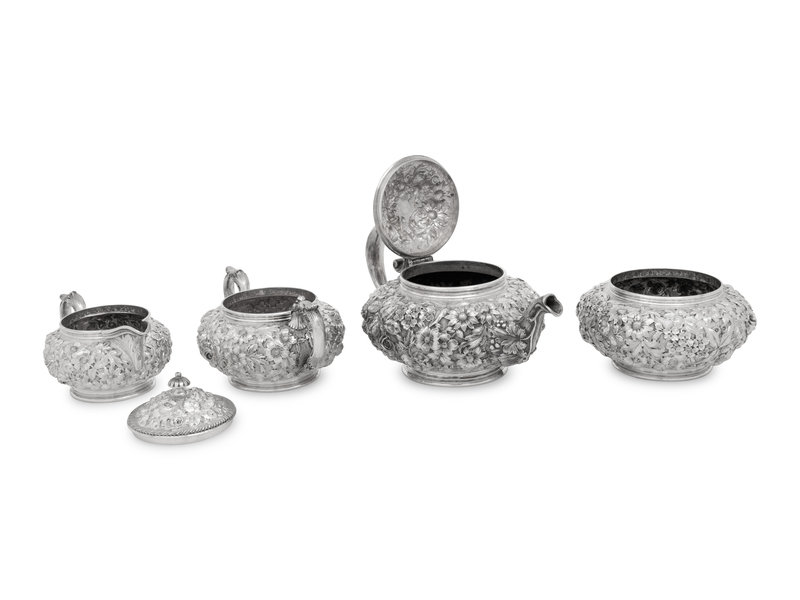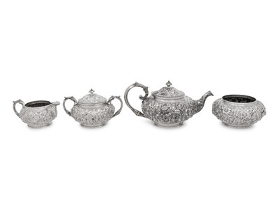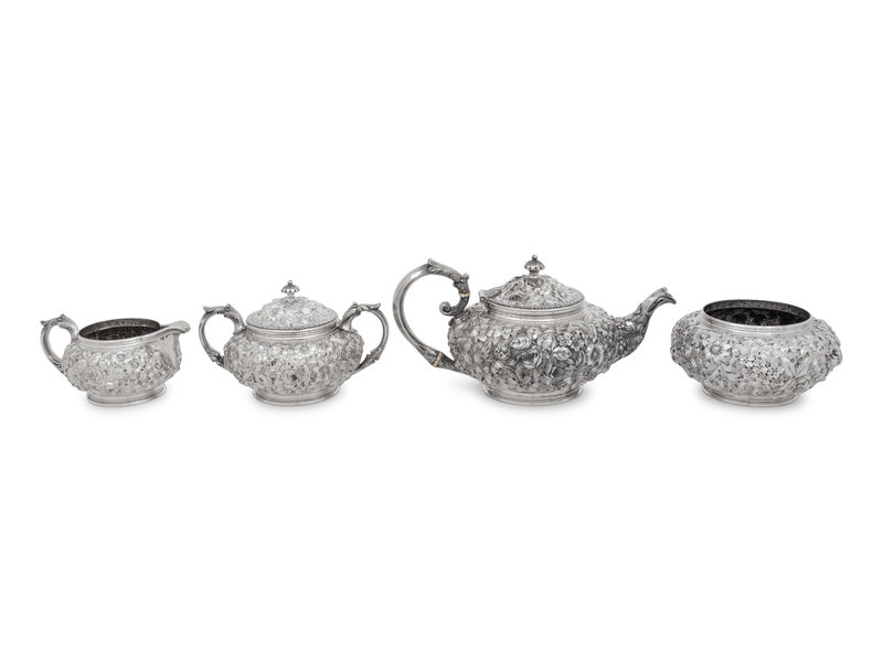 comprising a teapot, creamer, covered sugar and waste bowl, each with engraved monogram 'RMS' to the underside.