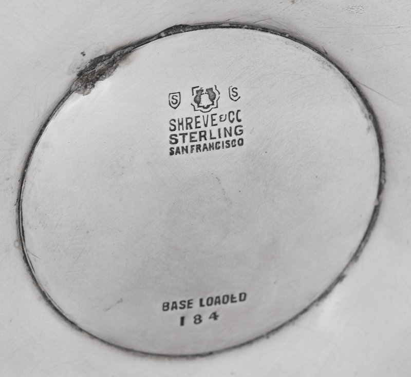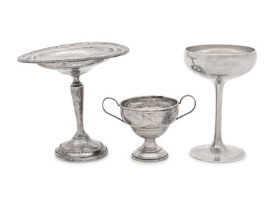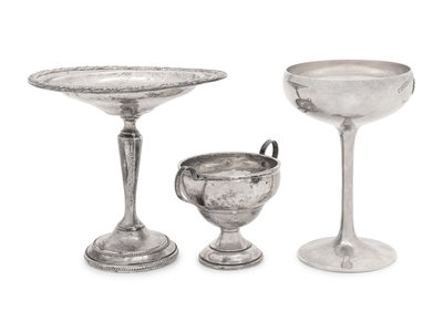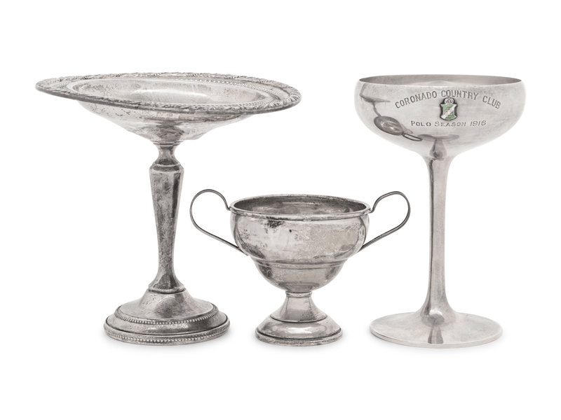comprising a Shreve & Co. presentation compote engraved Coronado Country Club/ Polo Season 1916 surrounding an applied enamel crest, a Webster Co. tazza and a sugar bowl.