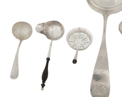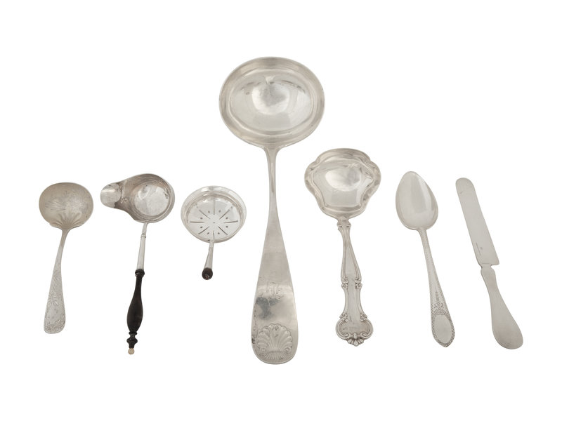 comprising four ladles, two with partial wood handles, five Lunt spoons and ten Crosby and Morse knives; 19 items total.