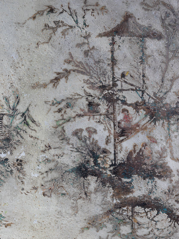 etched, patinated, and polychromed bronze, pewter
