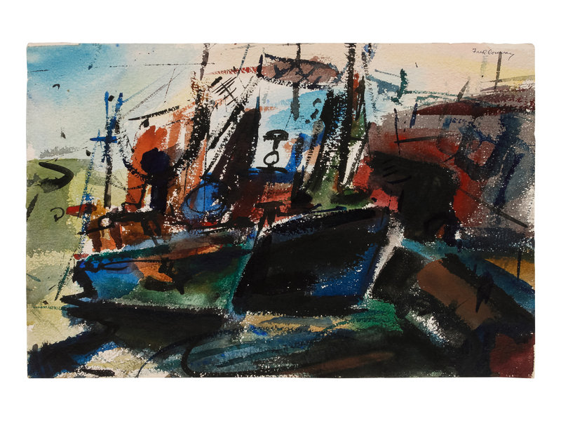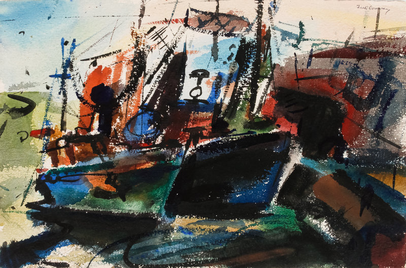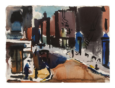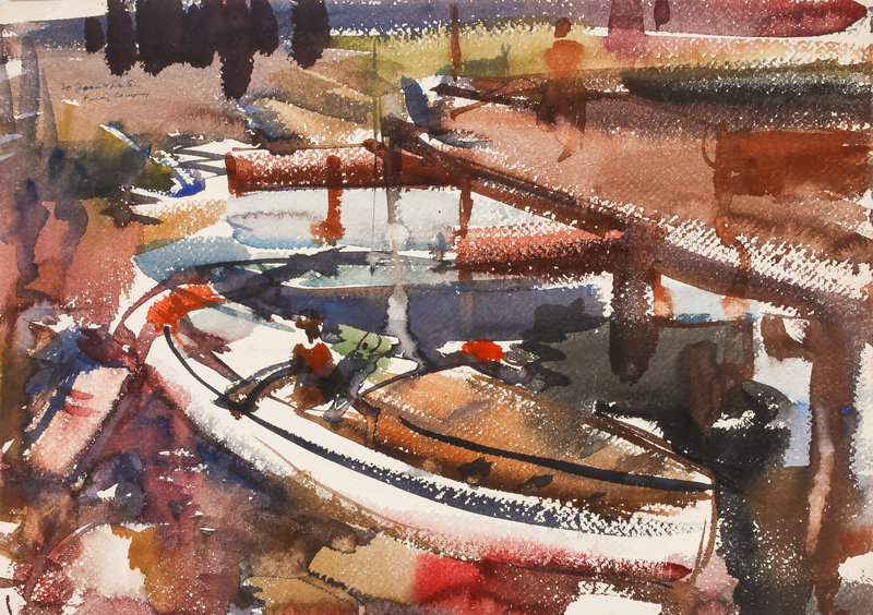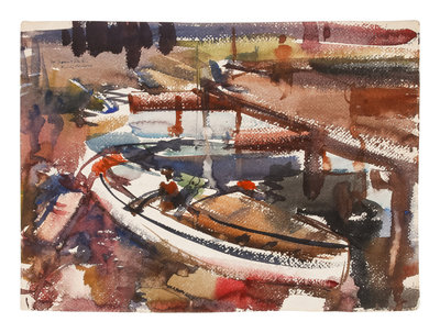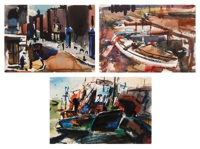 Three works: Harbor Scene; Street Scene and Docked Boat