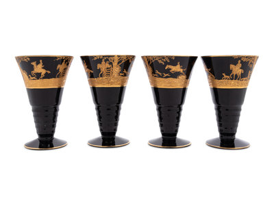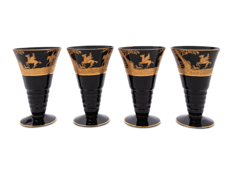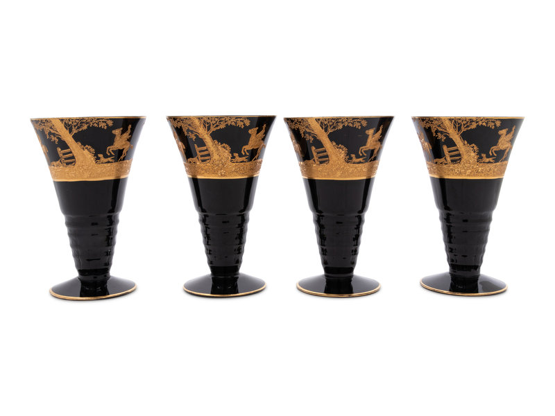 Four Continental Gilt Decorated Dark Amethyst Glass Goblets Depicting Hunting Scenes