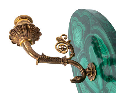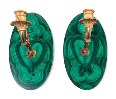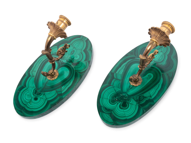 A Pair of Gilt Metal and Malachite Veneered Single-Light Sconces