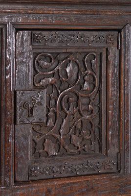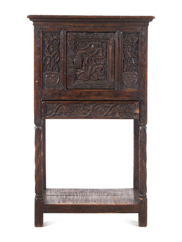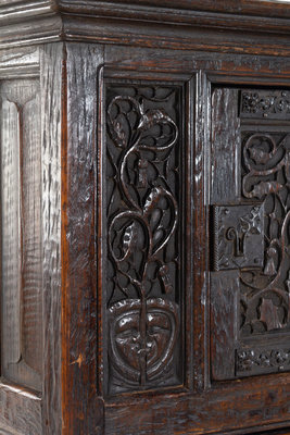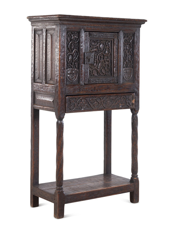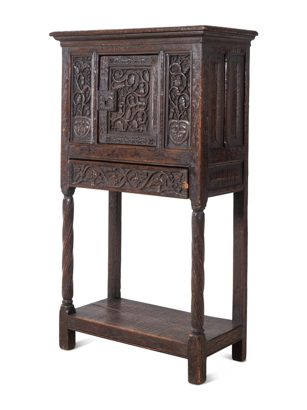 A Gothic Revival Carved Oak Cabinet on Stand