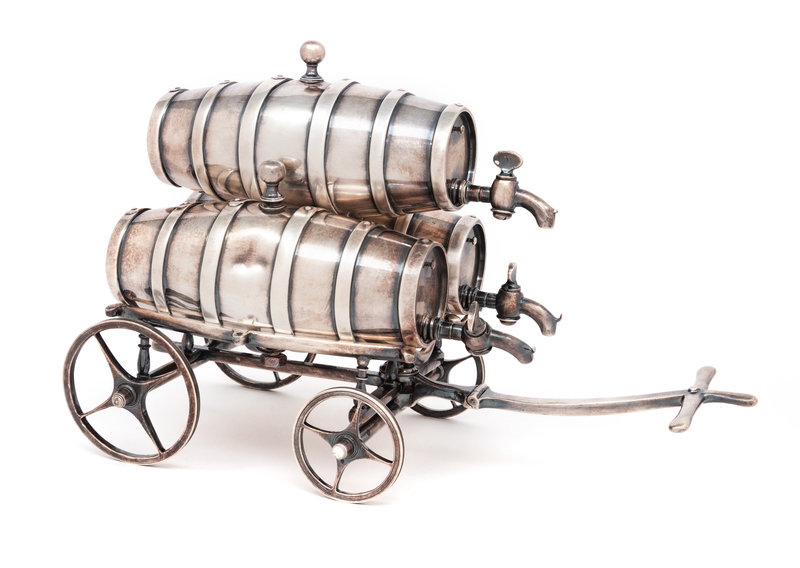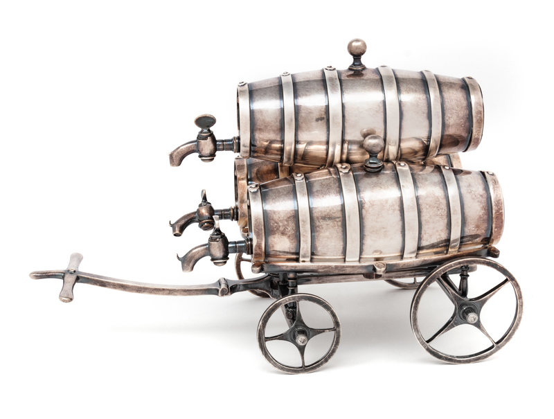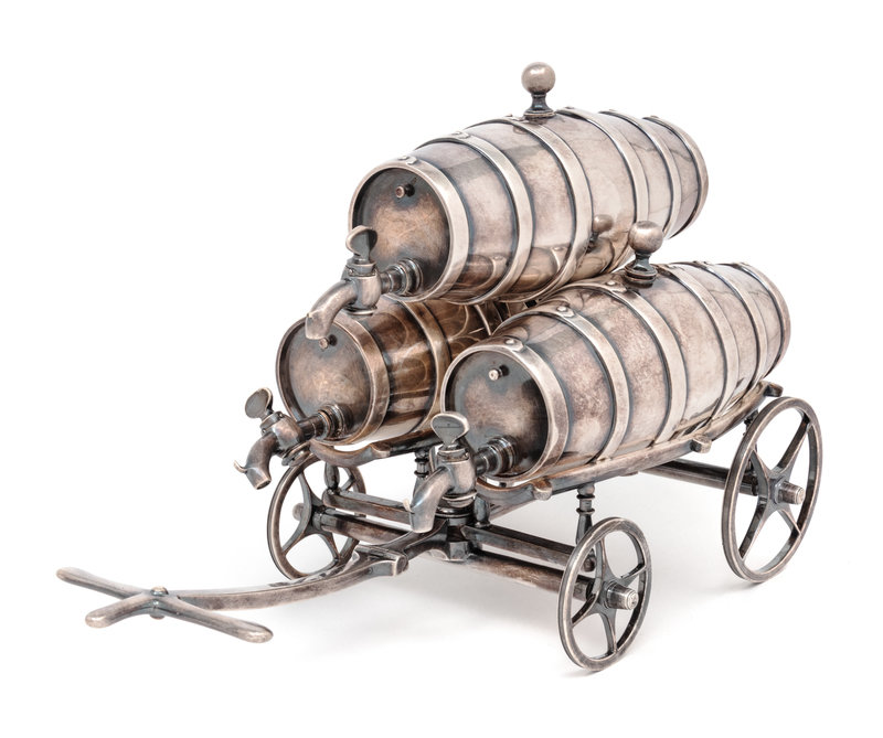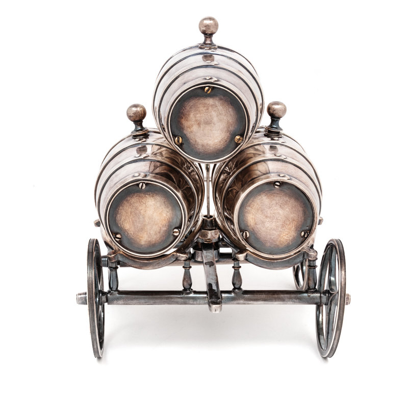 A Victorian Novelty Silver-Plate Triple Spirit Barrel Trolley