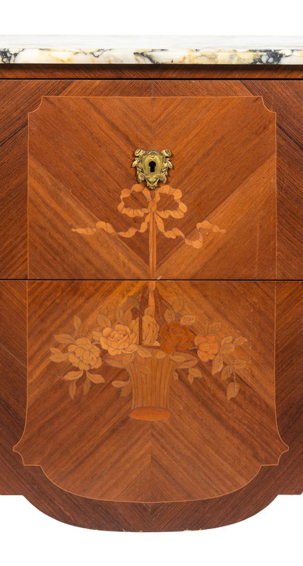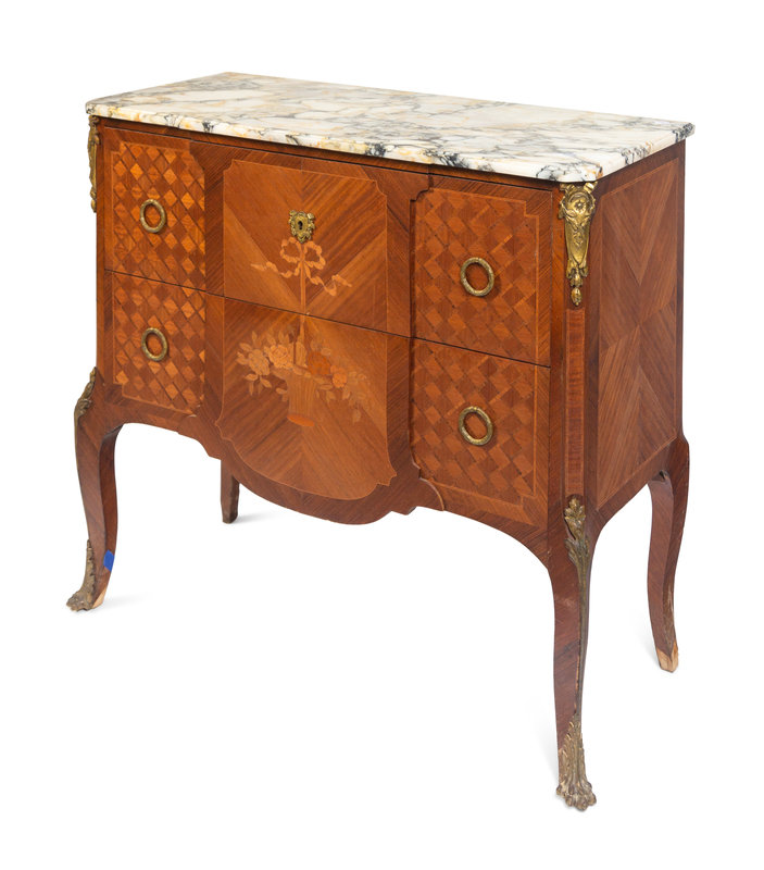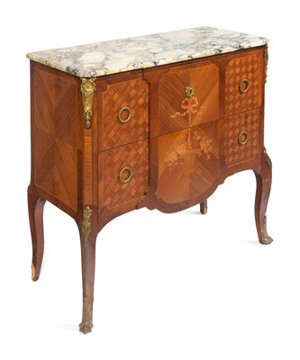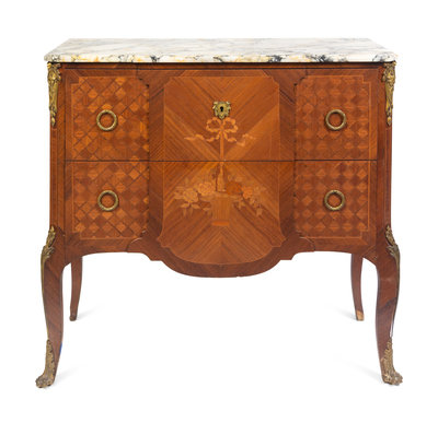 A Louis XV/XVI Transitional Style Marquetry Marble-Top Commode