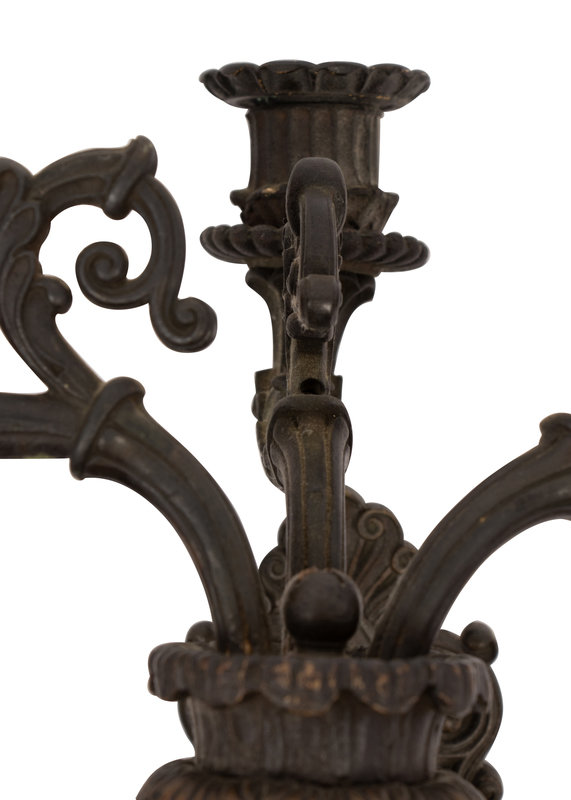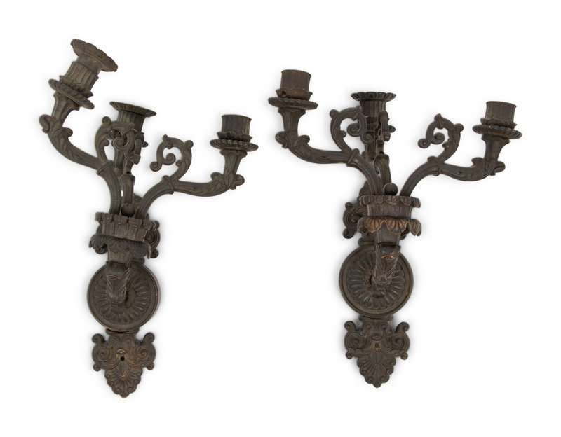 A Pair of Neoclassical Patinated Metal Three-Light Wall Sconces