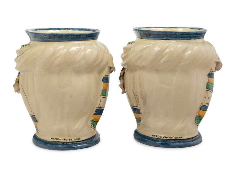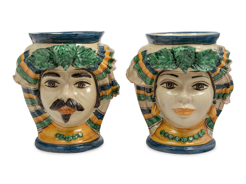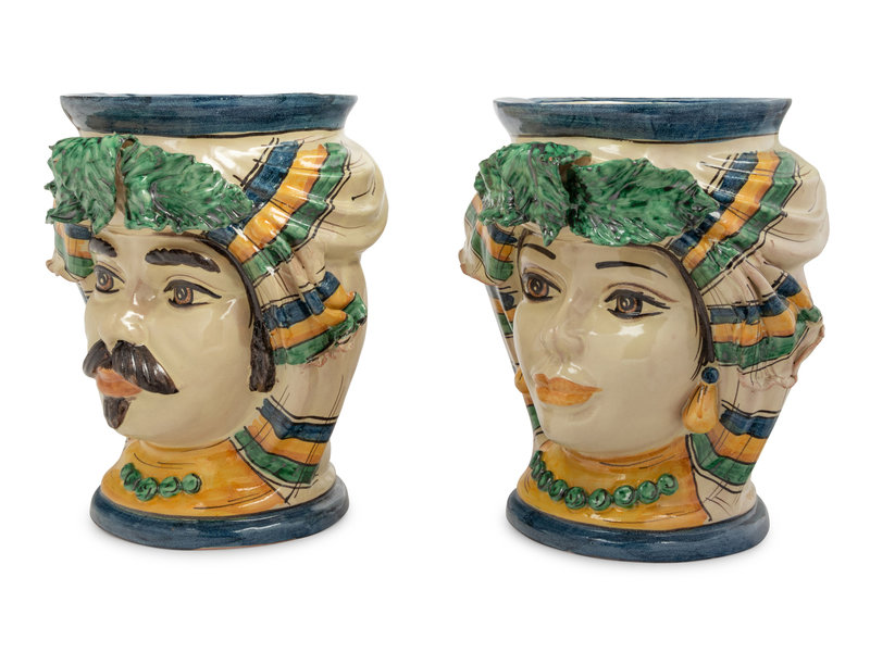 A Pair of Italian Polychrome Glazed Pottery Figural Vases