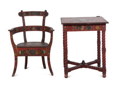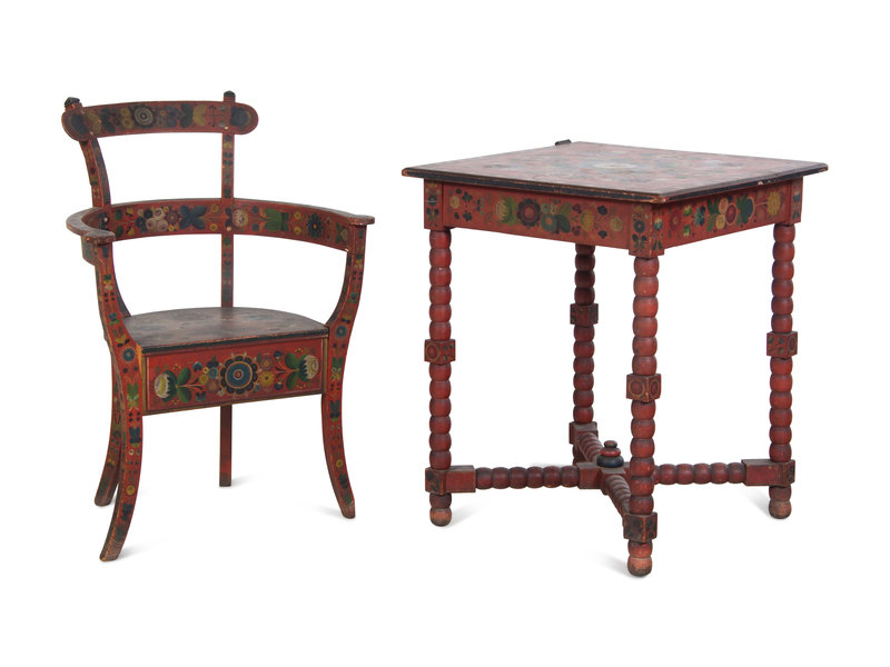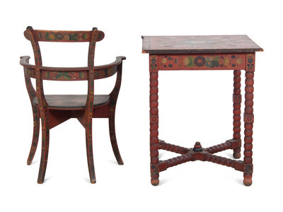 Height of table 30 1/4 x width 25 x depth 24 1/2 inches; height of chair 34 x width 25 x depth 15 inches.
