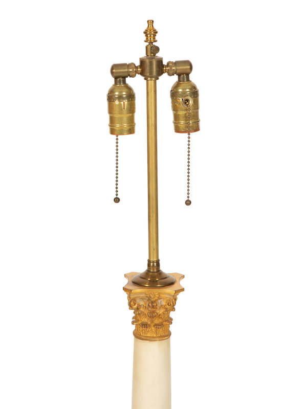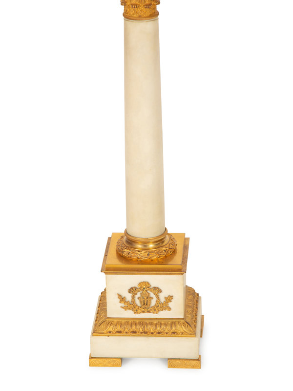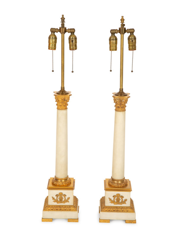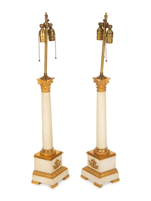 A Pair of Gilt Bronze Mounted White Marble Columnar Table Lamps