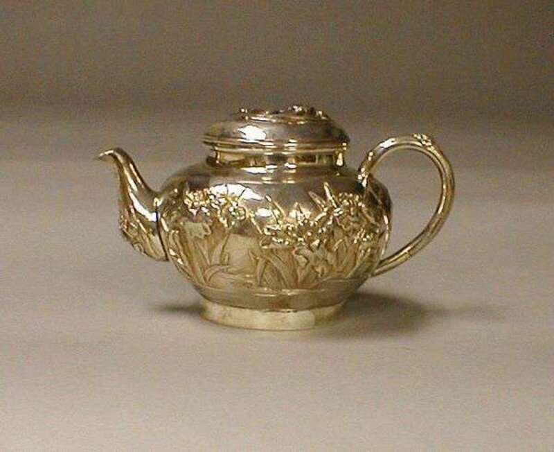 Of globular form with 'c' handle and repousse design of lillies growing up from a pond, h: 3.75 in.