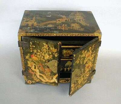 With a pair of doors opening to reveal two short and one long drawer, gilt decoration throughout, w: 11 in., h: 9 in., d: 7 in.