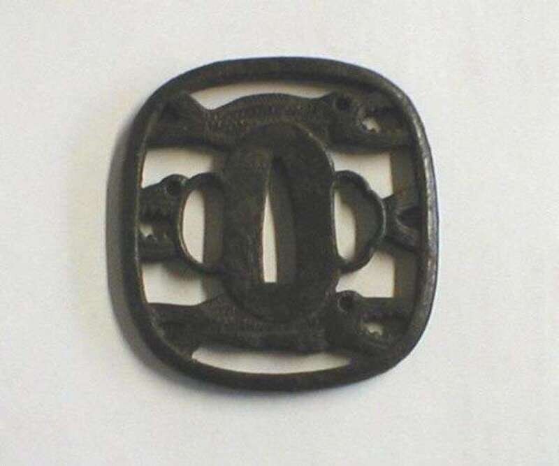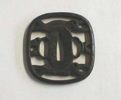 Square with rounded corners and a pierced and carved design of toothy fish, l: 2.6 in.