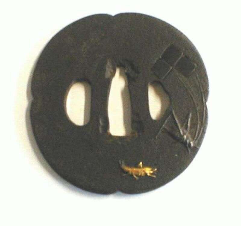Circular with four notches at the edge and a mixed metal inlaid design of two grasshoppers, the verso with a tea bowl and a beetle, a crest of four diamonds pierced and plugged with shakudo, dia: 3 in.