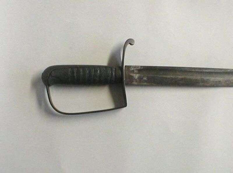 With iron stirrup hilt and leather covered grip, the straight blade with wide fuller and stamped "N. STARR US L.S. V" (L.S. is for the inspector Luther Sage), some losses to grip, l: 31 in.