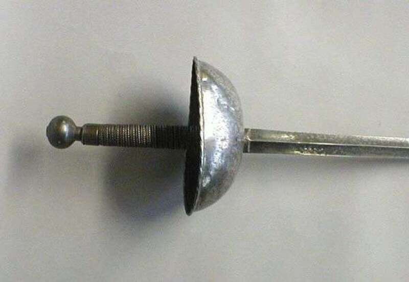The steel cup hilt with twisted wire grip and ball finial, the triangular, narrow blade with maker's mark and hallmark, l: 42 in.