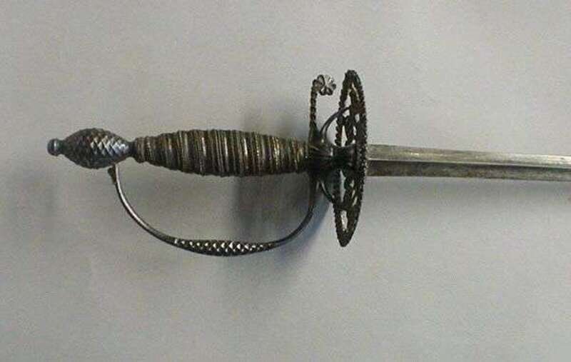 The iron hilt with faceted guard and pommel, pierced and dimpled counterguard and wire-wrapped leather grip, with a narrowed triangular blade, l: 31.5 in.