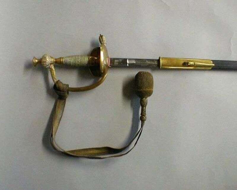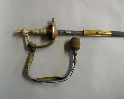 The cast brass hilt gilded and with folding counterguard, the handle wrapped in silver wire, the blade with decorative etching and bearing the German Imperial Eagle, sheathed in a leather scabbered with brass mounts, retaines a gold bulion sword knot, l: 36 in.