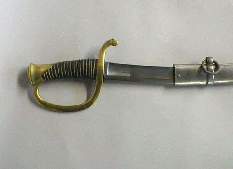 With simple brass hilt and wire-wrapped leather grip, the curved blade sheathed in a steel scabbard, various proof marks, l: 38.75 in.