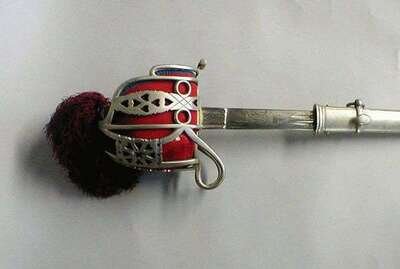 The nickel-plated hilt of typical full basket form, pierced with hearts, encasing a wool and leather cup, the grip of wrapped rayskin, the blade with decorative etching and bearing the Royal Coat of Arms of Queen Victoria, housed in a nickel-plated scabbard, l: 40 in.