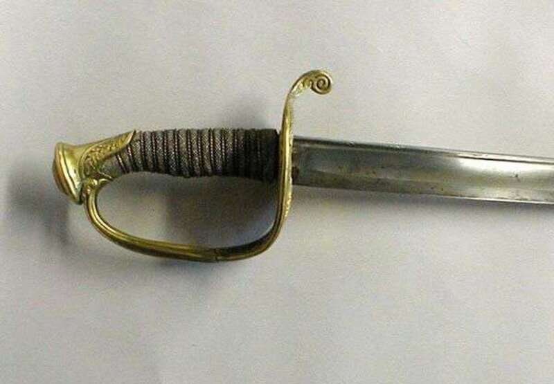 the cast brass hilt with floral motif and rayskin wrapped grip, l: 34 .75 in. break to hilt.
