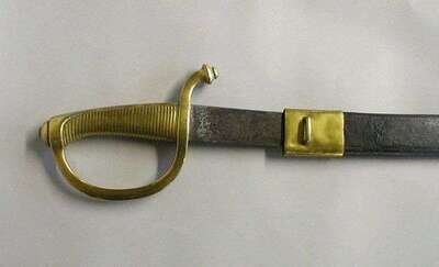 With cast brass hilt and handle, and wide curved blade, sheathed in a leather scabbard with brass mounts, l: 29 in.