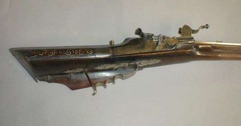 Approx. .45 cal. with heavy octagonal barrel, the lock mechanism engraved with chased triggerguard, the walnut stock with scroll carving and metal inlay, inset with mother-of-pearl panels, horn buttplate and sliding wood & horn patchbox, l: 50 in.