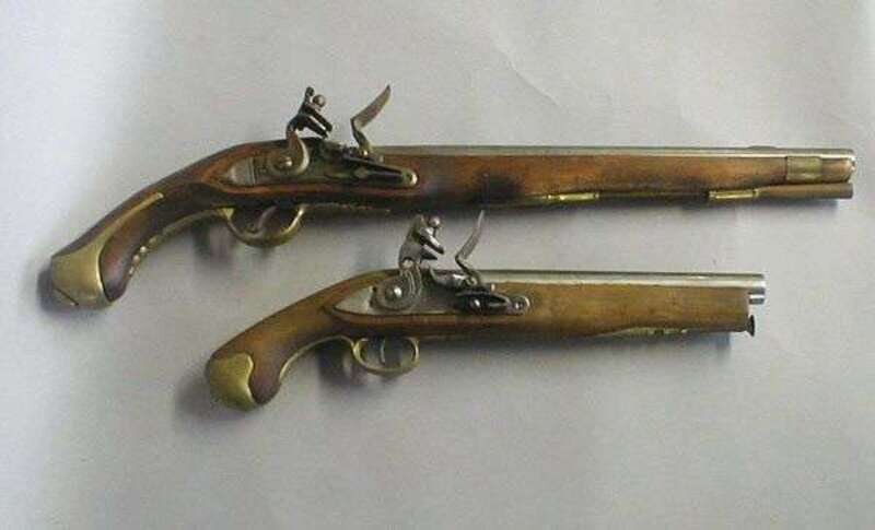 Each about .69 cal. with brass hardware and steel flintlock action/barrel, l: 15.5, 23.5 in.
