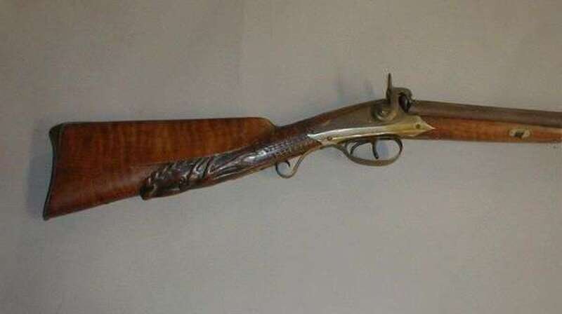 14 gauge, with double engraved percussion locks, engraved brass hardware and stock with carved deer head, light surface rust to barrels, l: 46 in.