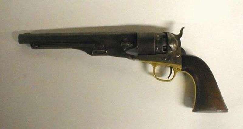 .44 cal., nice even patina to metal, exc. walnut grips, mismatched serial numbers, v.gd.
