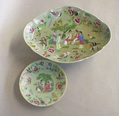 Of ingot shape on a spreading foot, with rose mandarin style figures, birds and butterflys against a celadon ground, together with six matching small plates, enamel wear, length of server: 14.25 in.