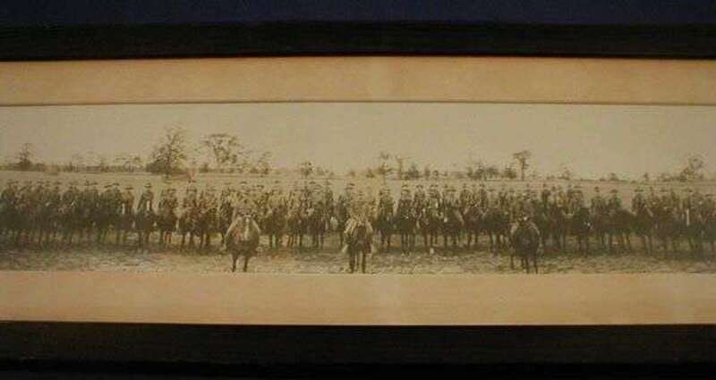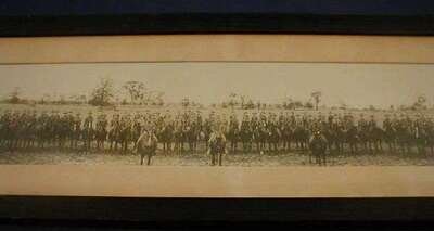 Depicting a "Cavalry Military Instruction Camp. Plattsburgh, N.Y. Sept. 8 to Oct. 6 1915"; a line-up of U.S. cavalrymen in campaign attire astride their mounts in an open field, officers in front, in the original mat and frame, exc., sight: 45.5 x 7 in.