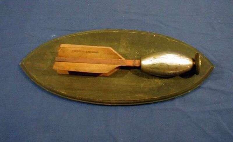 With ovoid iron head and cup detonator, wood shaft with original cardboard fins, one stamped "PATENTED AUG 20 1861"; mounted on a wooden plaque with late 19th c. label to reverse testifying to its usage, tiny bend to one fin, iron has been nickeled in 19th c.length of grenade: 13 in.