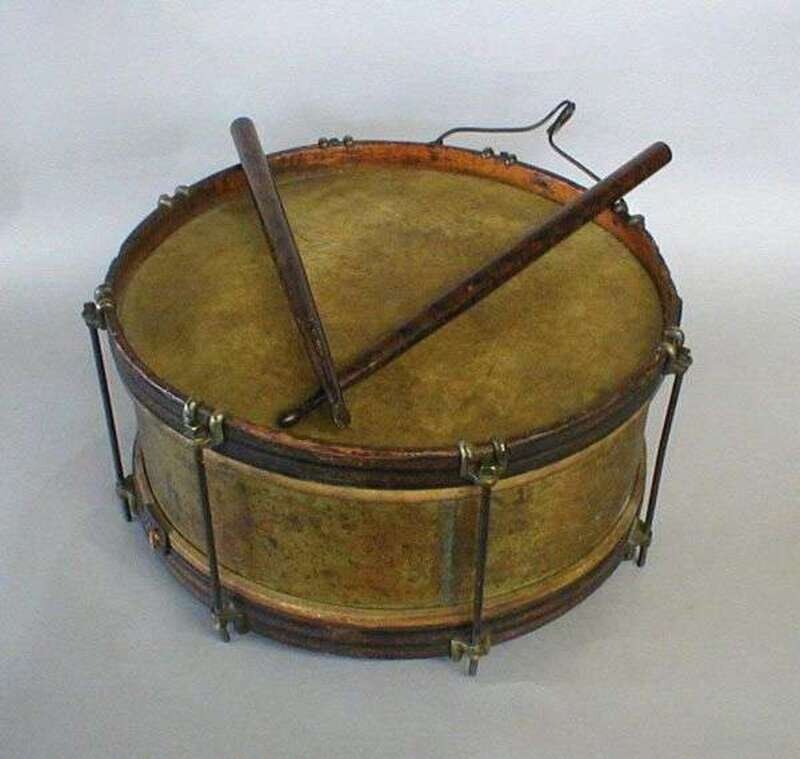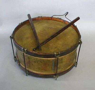 With inlaid wooden hoops, brass body, iron rod tension, animal skin heads chips and wear to hoops, together with period rosewood sticks, repaired, height to drum: 7 1/2 inches, diameter: 16 1/2 in.