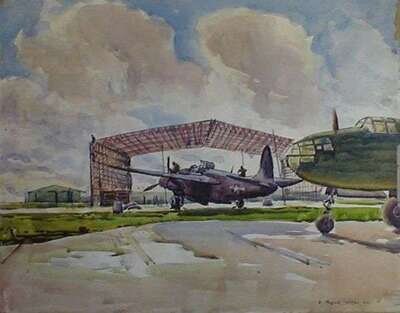 Watercolor on board, depicting a partially built hanger, two planes in foreground, signed and dated lower right, 18.5 x 23.5 in.