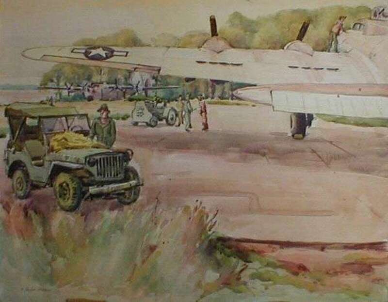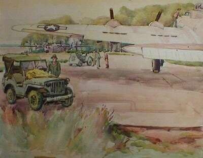 Watercolor on board, depicting the wing of a plane above GIs and Jeeps, signed lower left, 18.5 x 23.5 in.