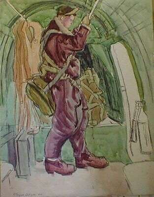 Watercolor on board, depicting a aircrewman in sheepskin flight suit preparing to parachute from a plane, lifevests and equipment about, signed and dated lower left, 18.5 x 23.5 in.