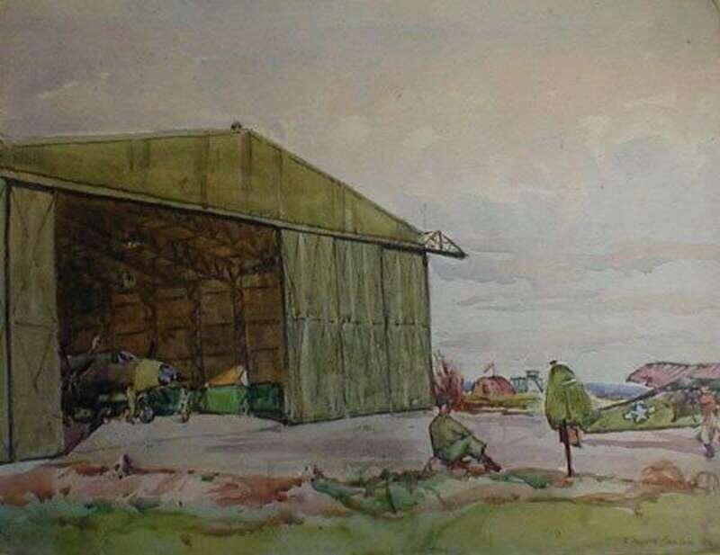 Watercolor on board, depicting an open hanger with men and planes, airfield and observation tower in the distance, signed and dated lower right, 18.5 x 23.5 in.