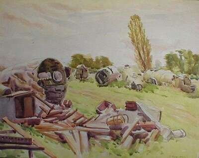 Watercolor on board, depicting a field full of plane wreckage and parts, signed lower right, 18.5 x 23.5 in.